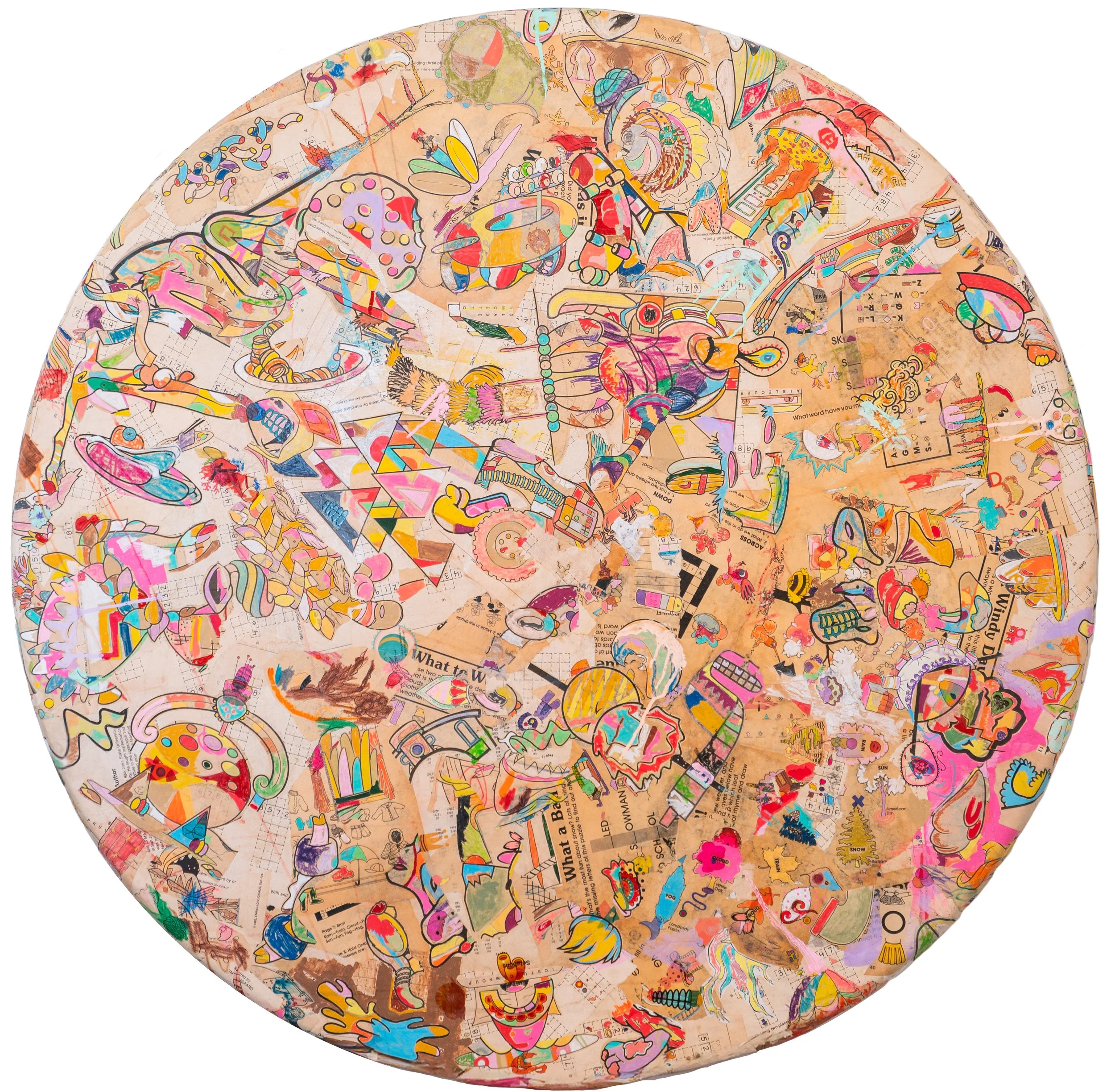 HARD BELOW | Shield 2 (2024) 4 ft. diameter // mixed media on mounted rotating support [temporary tattoos, coloring books, acrylic paint, crayon, pastel, pencil, marker]