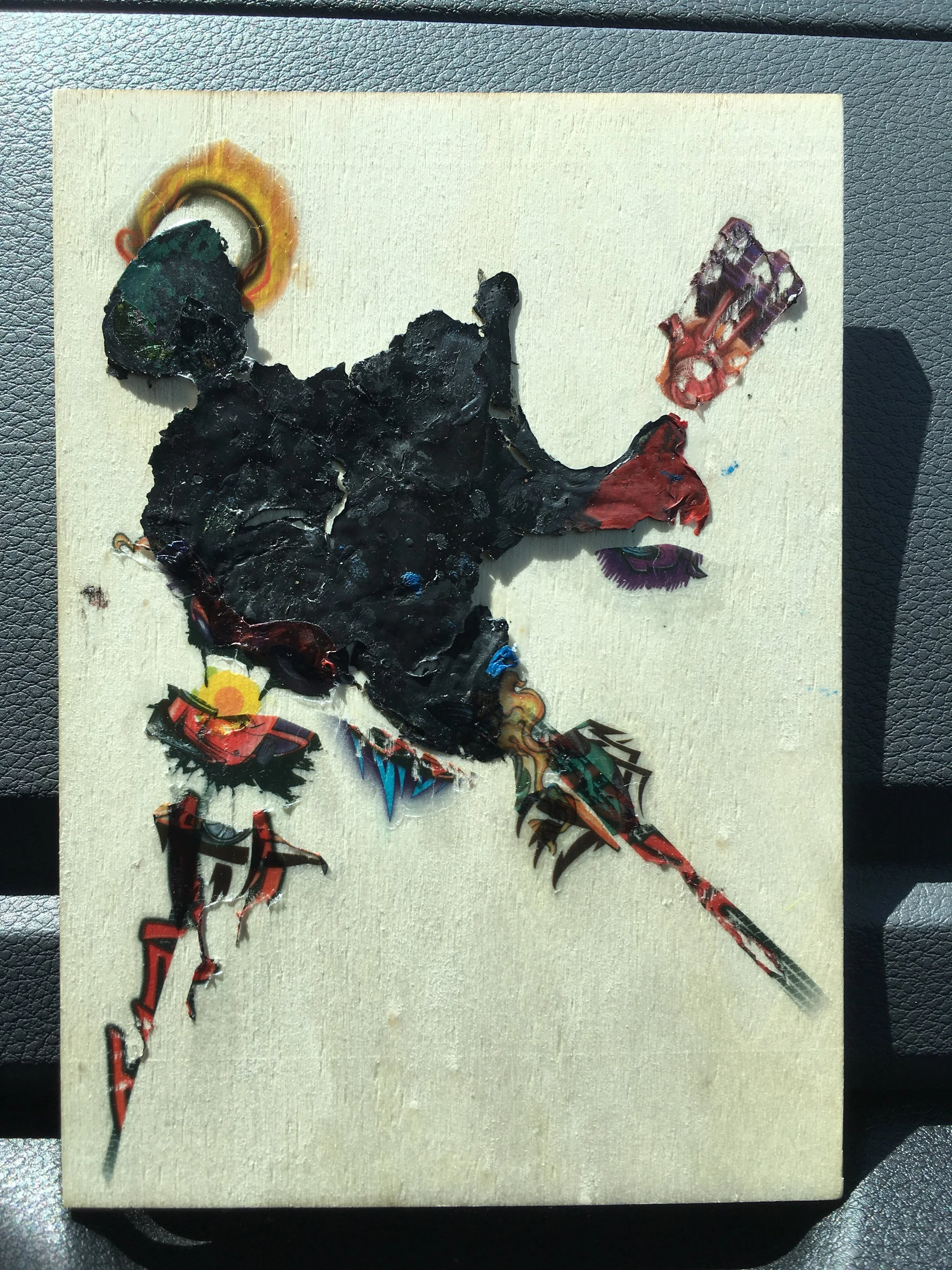 (DETAIL) HARD BELOW | Shield 2 (2024) 4 ft. diameter // mixed media on mounted rotating support [temporary tattoos, coloring books, acrylic paint, crayon, pastel, pencil, marker]